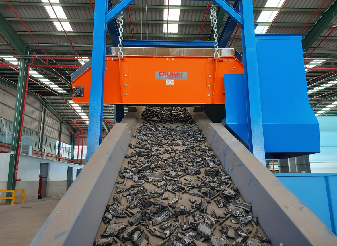 Estos sistemas electromagnéticos funcionan mediante una bobina envuelta sobre un núcleo que alimentado por corriente continua crea un campo magnético oportunamente dimensionado en base a la distancia de atracción necesaria teniendo en cuenta la capa y la tipología del material transportado, sobre el cual gira alrededor una banda de goma extractora que separa automáticamente, sin tiempo de inactividad de producción, eventual material ferroso, permitiendo la recuperación de material magnéticamente permeable y preservando de potenciales roturas las cuchillas de las trituradoras, de los molinos y de las moliendas, además de garantizar un producto final libre de acero ferro magnético.